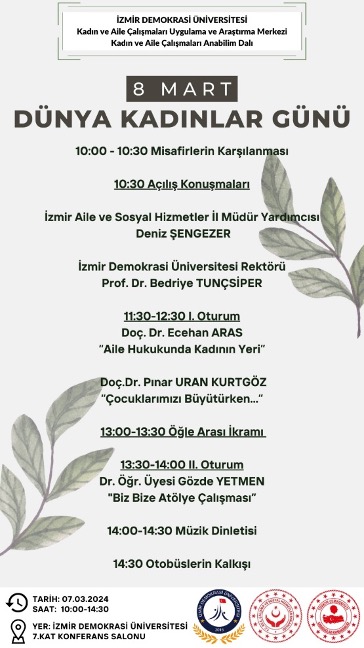 İzmir Demokrasi Üniversitesi Kadın ve Aile Çalışmaları Uygulama ve Araştırma Merkezi, 8 Mart Dünya Kadınlar Günü kapsamında, kadın idari ve akademik personel, kadın öğrenciler ve koruma altındaki kadınların katılımıyla bir panel düzenledi. Etkinlik, İzmir Aile ve Sosyal Hizmetler İl Müdürlüğü ve Karabağlar Kaymakamlığı’nın işbirliğiyle 7 Mart 2024 tarihinde İzmir Demokrasi Üniversitesi’nin 7. Kat Konferans Salonu’nda gerçekleştirildi. Program saat 10:00’da başladı.